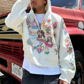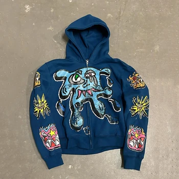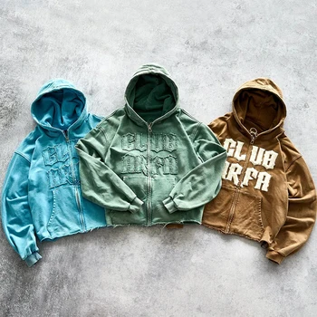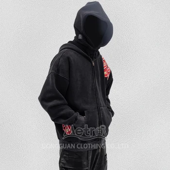 לוגו מותאם אישית מרועה רקמה במצוקה צרפתית קפוצ 'ון 500gsm כבד רוכסן קפוצ' ון 100% כותנה מותאם אישית קפוצ 'ון גברים